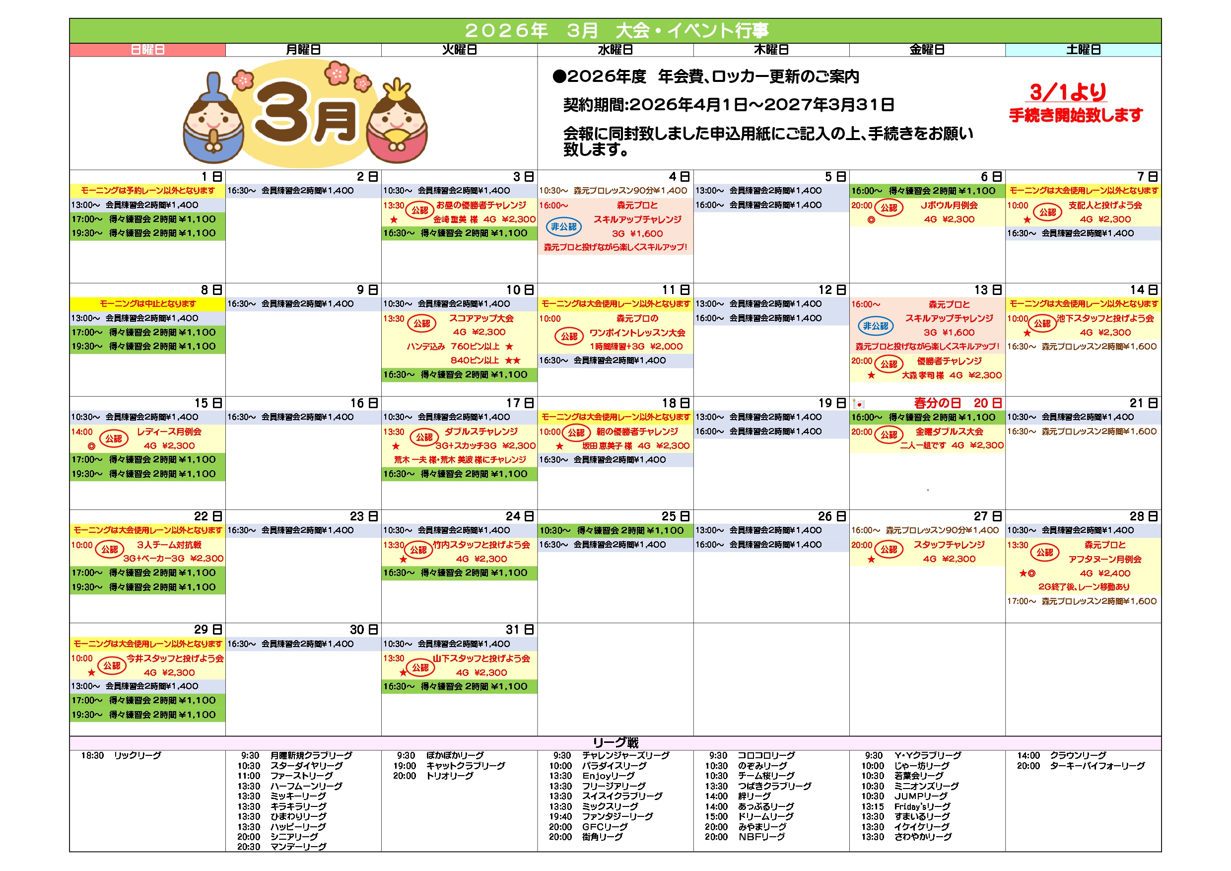 2026年3月の大会カレンダーをアップしました!